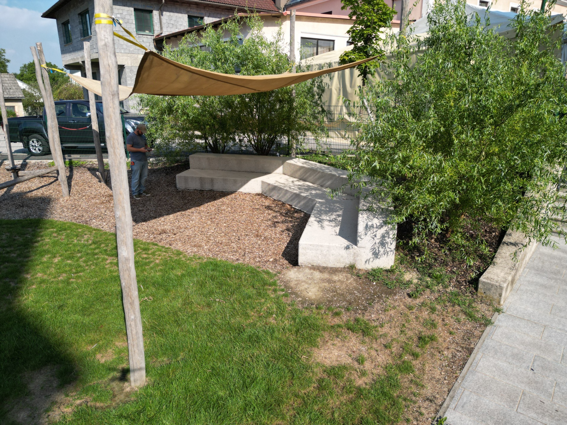 Das Areal gliedert sich in dynamische Zonen mit Sportplatz, Slackline-Parcours und Schaukelanlagen sowie in Bereiche für die Umweltbildung. Ein „Grünes Klassenzimmer“ mit textilem Sonnensegel schafft einen geschützten Lernort im Freien, eingebettet in eine ökologisch wertvolle Bepflanzung. Strategisch platzierte Gehölze sorgen für natürliche Beschattung und verbessern das Mikroklima auf der exponierten Dachfläche. So verwandelt sich die funktionale Versorgungsanlage in einen lebendigen, klimafitten Lebensraum für Schüler und Jugendliche.