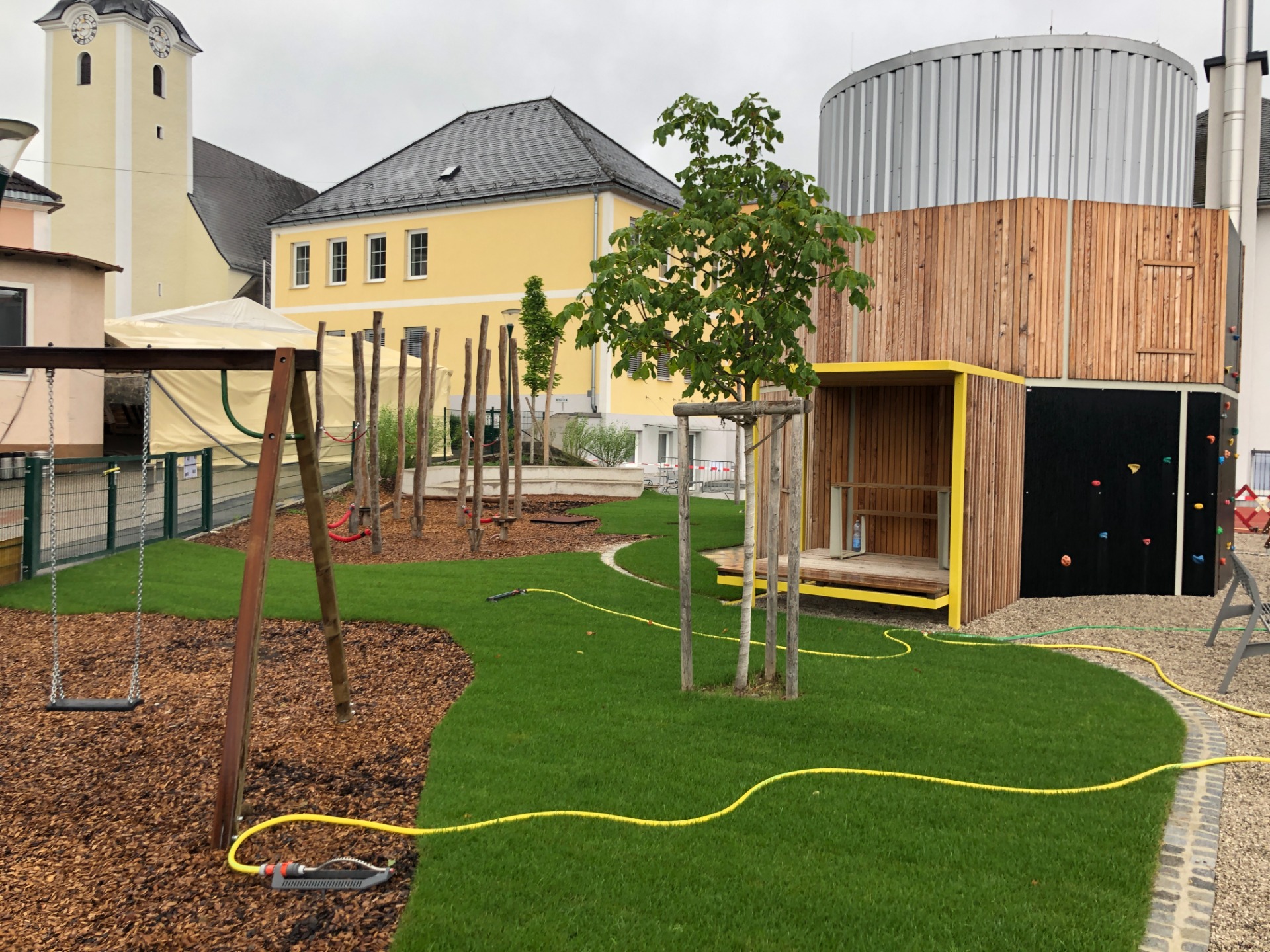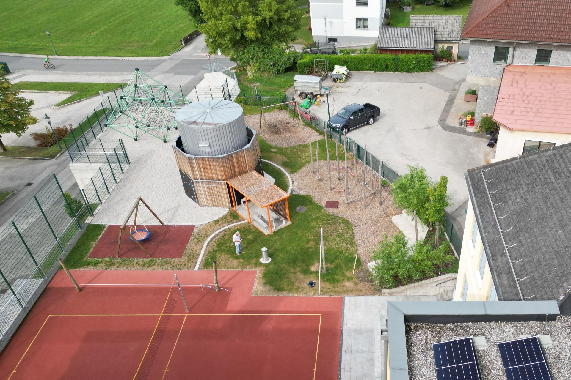 Das Projekt im Schulumfeld Biberbach demonstriert eine innovative Flächennutzung an der Schnittstelle von Infrastruktur und Pädagogik. Durch die Überbauung des Fernwärmewerks entstand eine multidimensionale Spiellandschaft, die technische Notwendigkeit mit hohem Spielwert vereint. Ein markanter Kletterturm fungiert dabei nicht nur als vertikales Spielelement, sondern dient gleichzeitig als architektonische Verkleidung der Fernwärme-Infrastruktur.