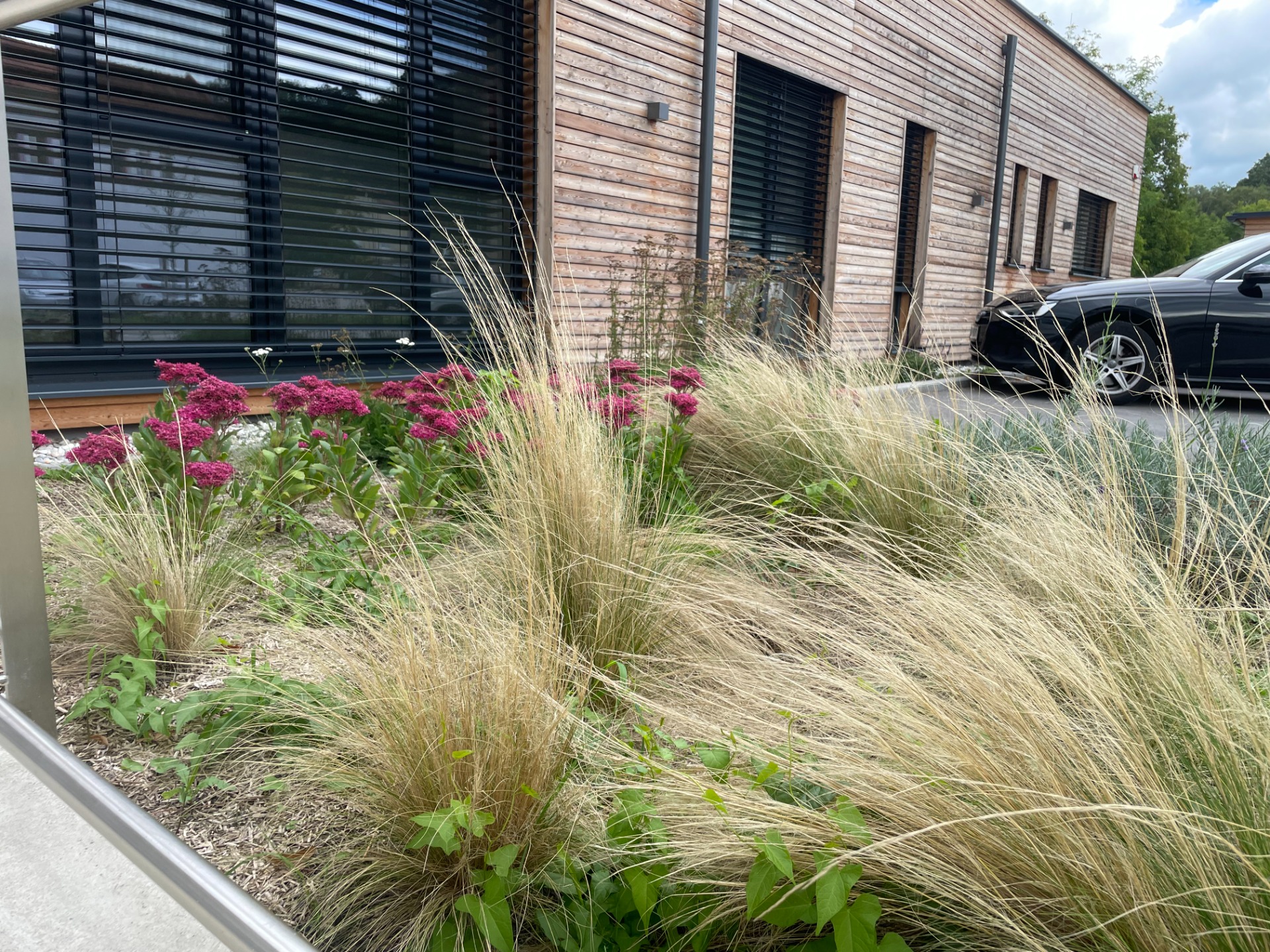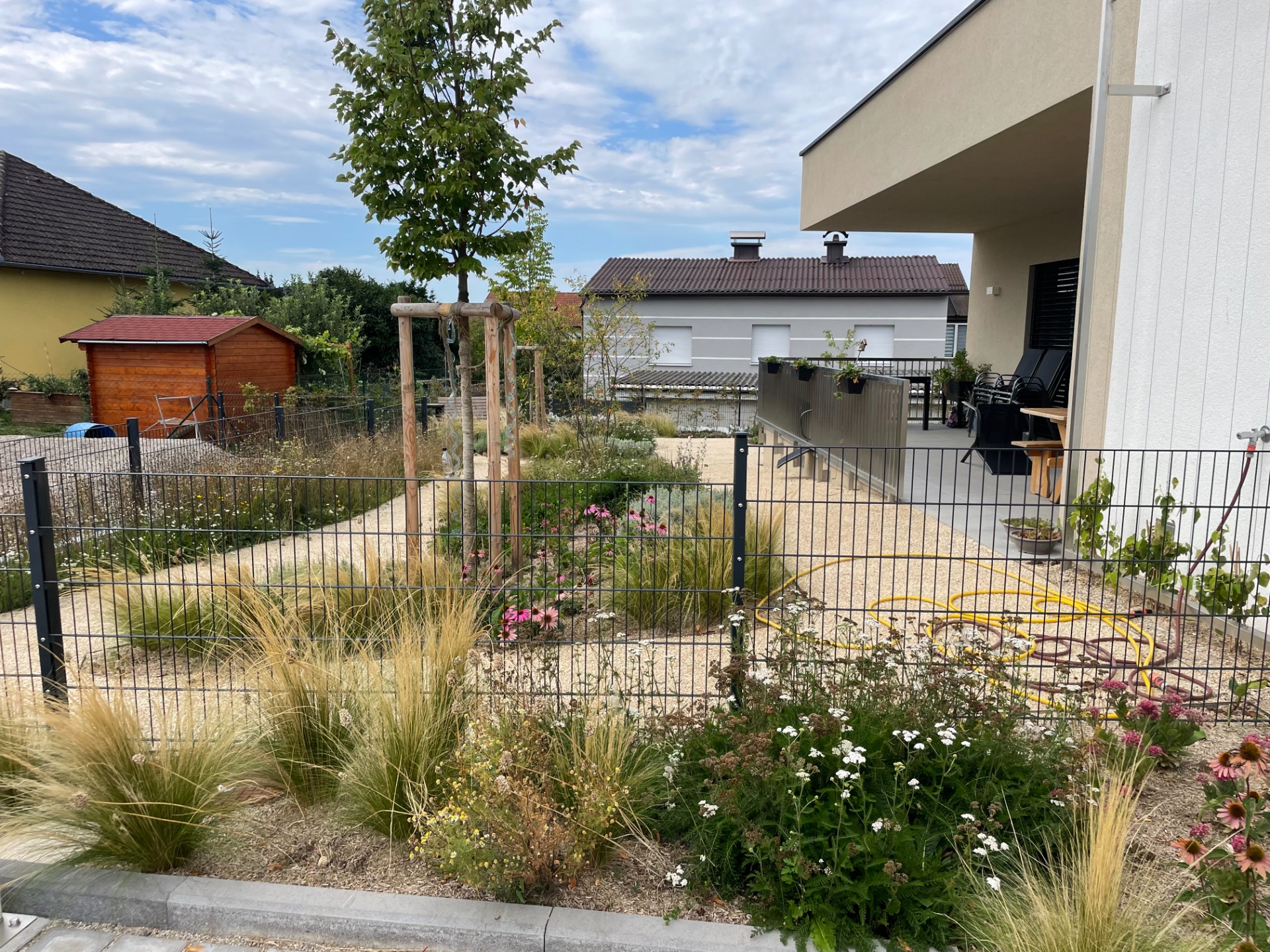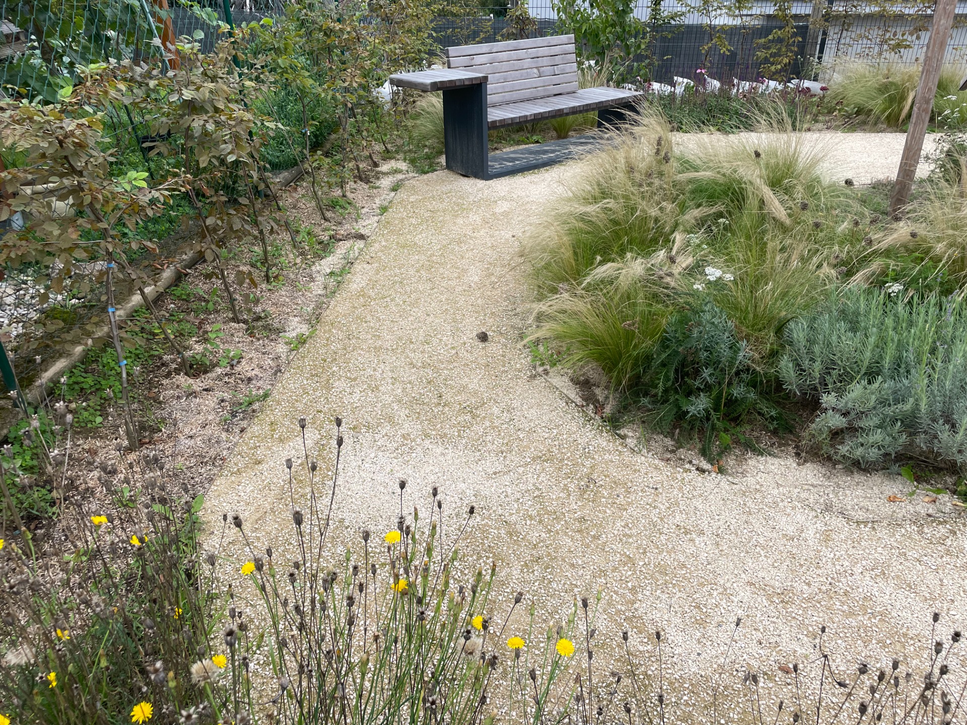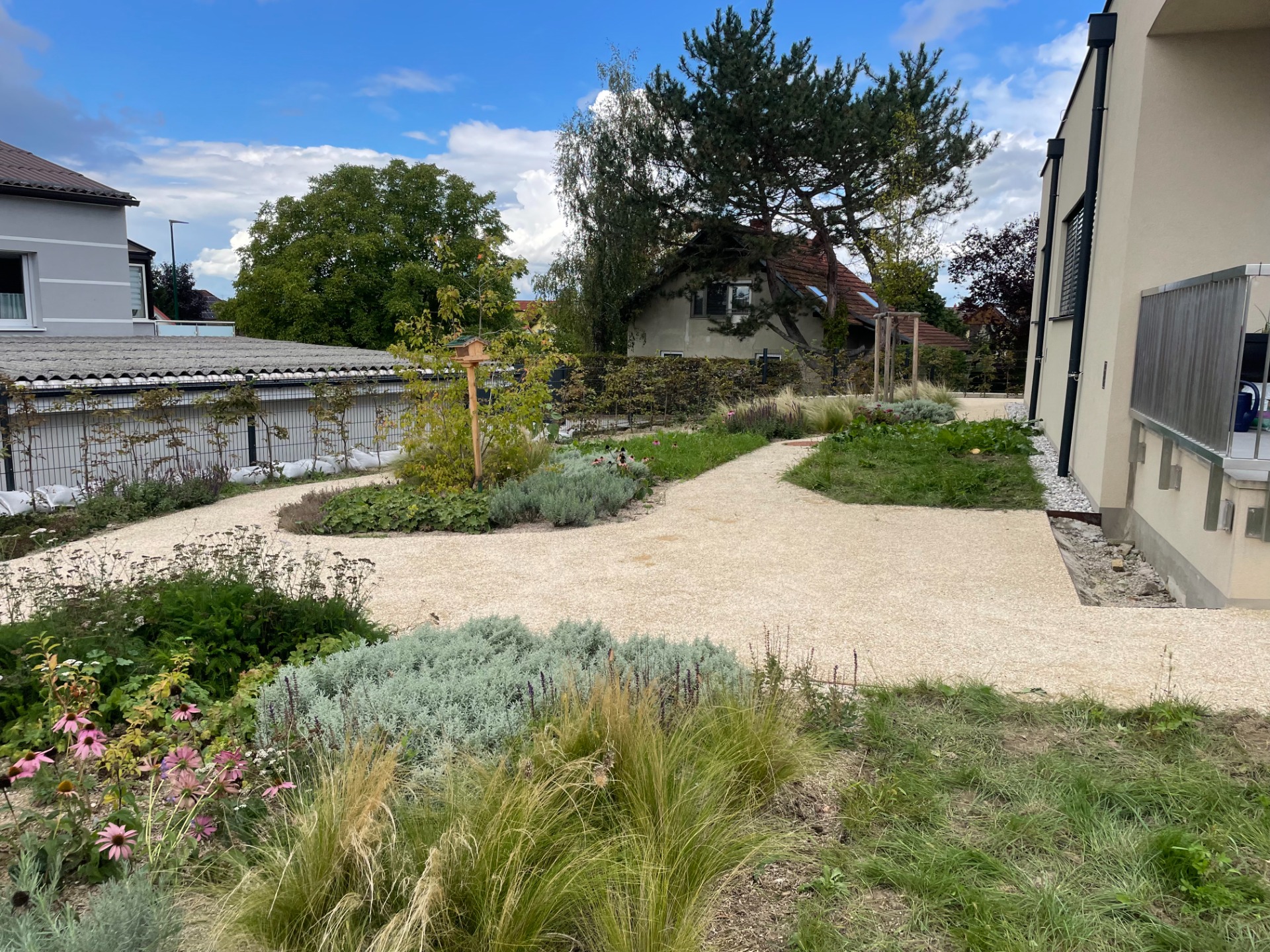 Das gestalterische Rückgrat bildet ein Netz aus schwellenlos begehbaren Wegen, das auch mit Gehhilfen das sichere Erkunden der gesamten Anlage ermöglicht. Idyllische Stauden- und Gräserpflanzungen setzen saisonale Akzente und laden zum Verweilen ein, während eine vertikale Fassadenbegrünung und sickerfähige Beläge das Mikroklima regulieren. Als klimafitte Antwort auf Hitzeinseln in stark versiegelten Gebieten kombiniert das Projekt biodiversitätsfördernde Pflanzkonzepte mit funktionaler Ästhetik. So entsteht ein resilienter Ort der Begegnung, der soziale Teilhabe ermöglicht und die Seele baumeln lässt.