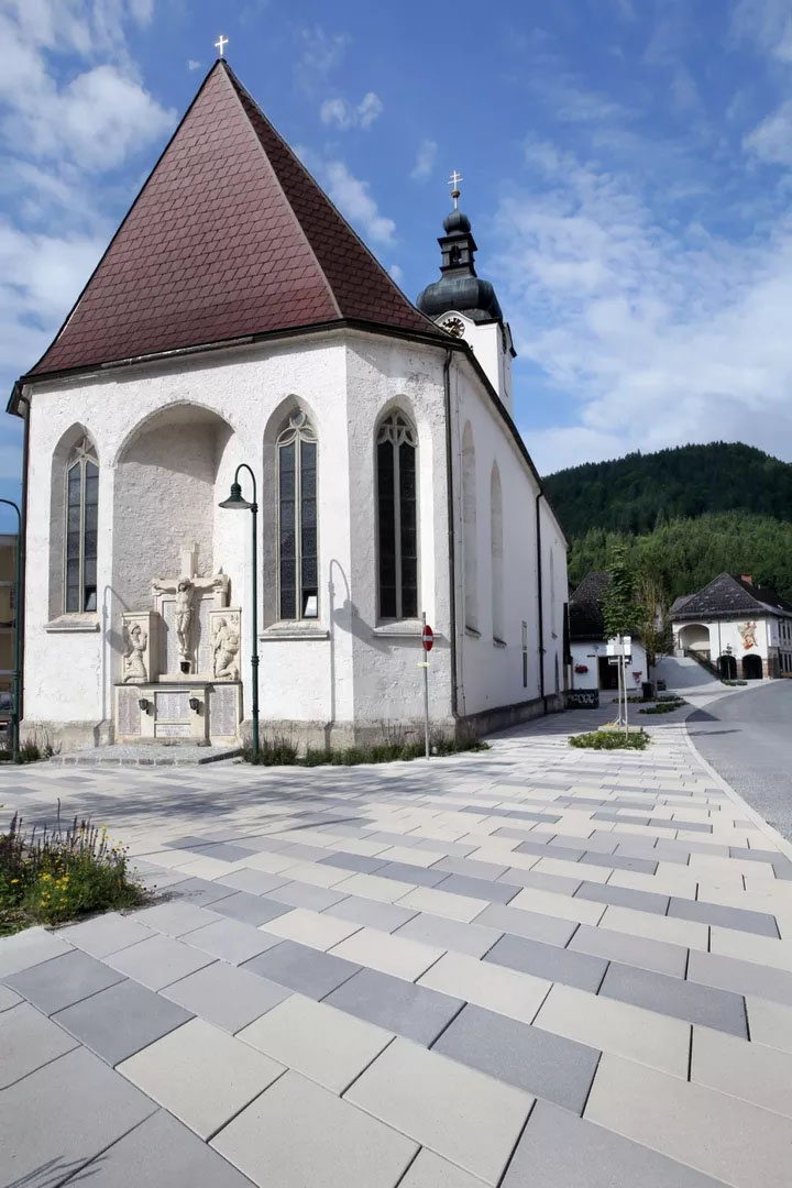 Die Hauptfahrbahn der Landesstraße wurde mit einem neuen Belag (Halbstarre Decke) versehen (Aufdopplung), der barrierefrei in straßenbegleitende Pflasterflächen übergeht. Die „Schichtpflasterung“ bildet den Rahmen, der aus verschiedenen Graufarbtönen besteht und das Schichtgestein der umgebenden Bergwelt abbildet.