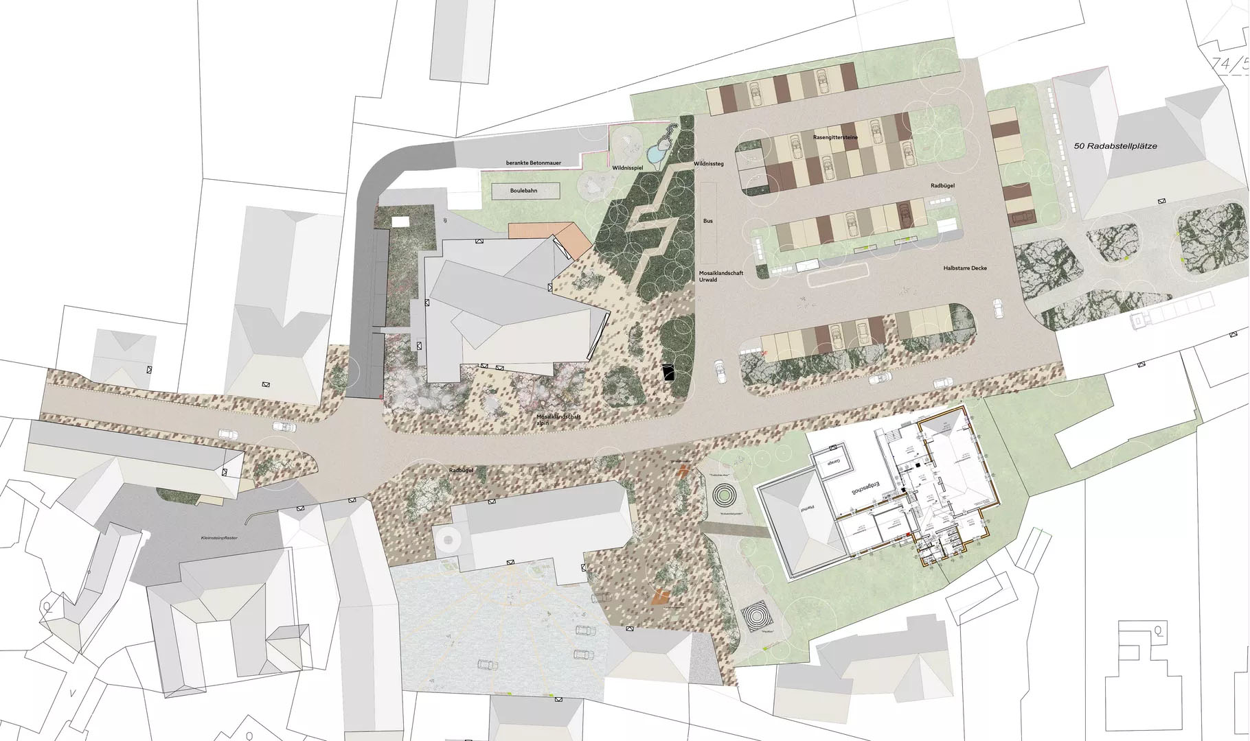 Die Öffnung zu allen Teilräumen hin ermöglicht eine durchgehende Vernetzung der Belebungszone im Ortszentrum sowie eine Optimierung der Erreichbarkeit örtlicher Geschäftslokalen. Die Aufenthaltsqualität im Ortszentrum wird ganz wesentlich durch die Kombination Grünräume und Freiraummöblierung verbessert.