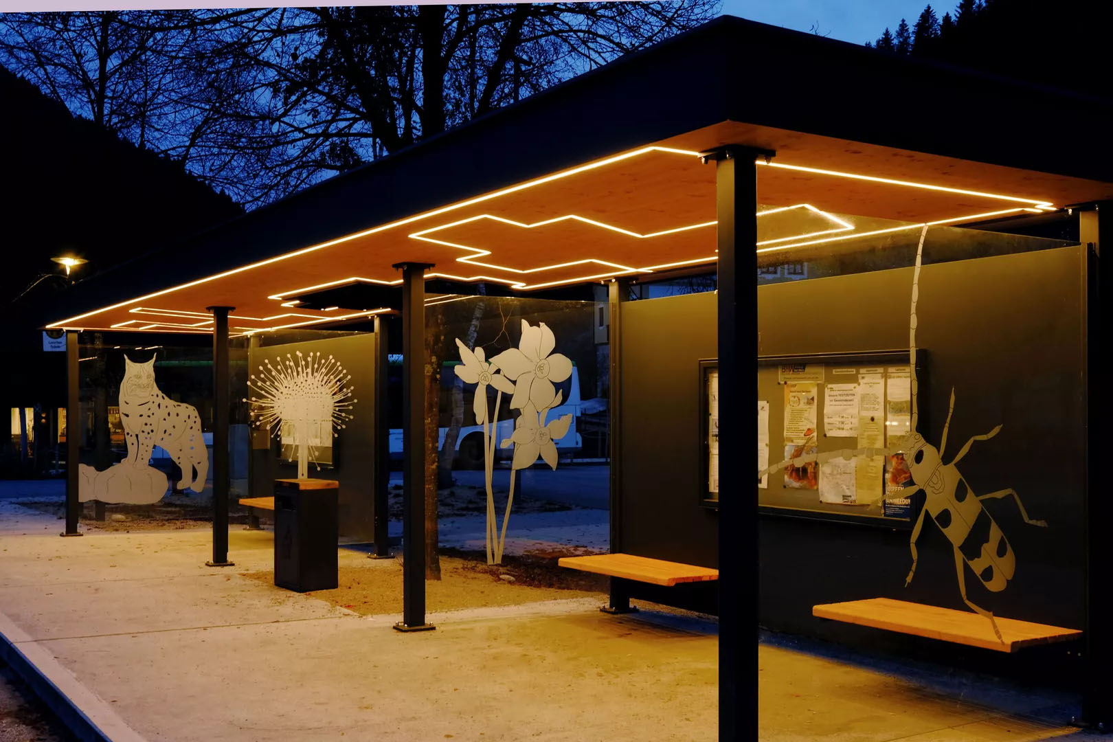Ausgehend vom Konzept des Freiraums für das Weltnaturerbezentrum in dem die Prozesshaftigkeit von Natur dargestellt wird, spannt sich das Grünraumkonzept auch über den Straßenraum und den Kirchenplatz. Die symbolhaften Schichten der alpinen Umgebung werden aufgebrochen durch Grüninseln. Stauden- / Gräserbeete wurden rund um fahrbahnbegleitende Laubbäume angelegt und betreuungsextensiv gepflanzt. Die Laubbäume spenden Schatten, bringen mehr Grün ins Zentrum und werten das Kleinklima auf.