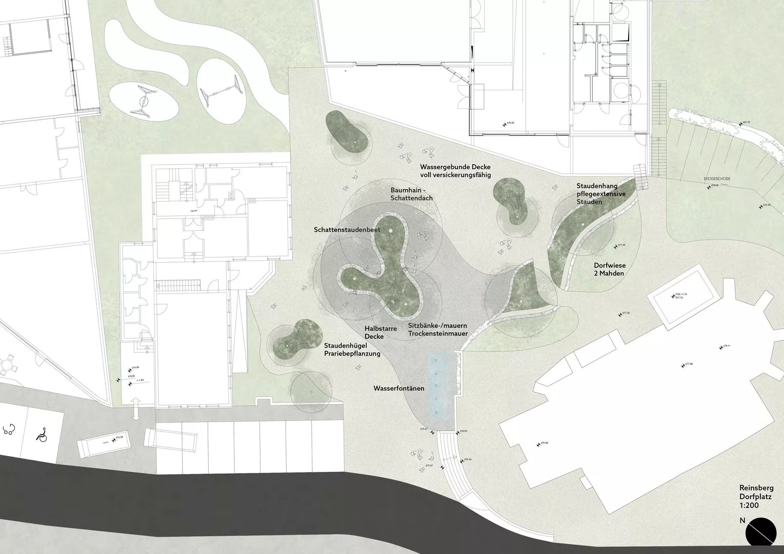 Unsere Zeiten sind Zeiten der Klimaveränderung. Wir sparen den Gedanken der wärmeren Sommer und der Knappheit von Ressourcen nicht aus und planen dementsprechend. Die Landschaft um Reinsberg sowie die wichtigsten Assoziationspunkte in der Landschaft werden im Vorentwurf ebenso berücksichtigt wie der Wunsch nach versickerungsfähigem Untergrund sowie das Spiel auf der freien Wiese. Die für den Ort charakteristische Ruine findet ihre Bedeutung in den Trockensteinmauern wieder, die sich in organischen Formen über den Platz ziehen, ihn gliedern und abstufen. Die Wassergebundene Decke lässt Wasser in den Boden versickern. Die Dorfwiese findet sich oberhalb des Platzes bei der Kirche wieder und verbindet die beiden Bereiche. Die Pflanzhügel bilden die Landschaft um Reinsberg ab und werden pflegeextensiv bepflanzt. Das grüne Herz Reinsbergs bildet die Platzmitte ab, um die sich eine Sitzmauer schlängelt und Schattenplätze unter dem Baumhain bietet. Wasserfontänen im Entrée des Platzes lassen Kinder und Junggebliebene Abkühlung in heißen Sommern finden. Großzügige Flächen in der Wassergebundenen Decke bieten Platz für Feste und Versammlungen. Ein Dorfplatz der zukünftigen Nutzungsansprüchen gerecht wird und auch der Natur Chancen gibt.
