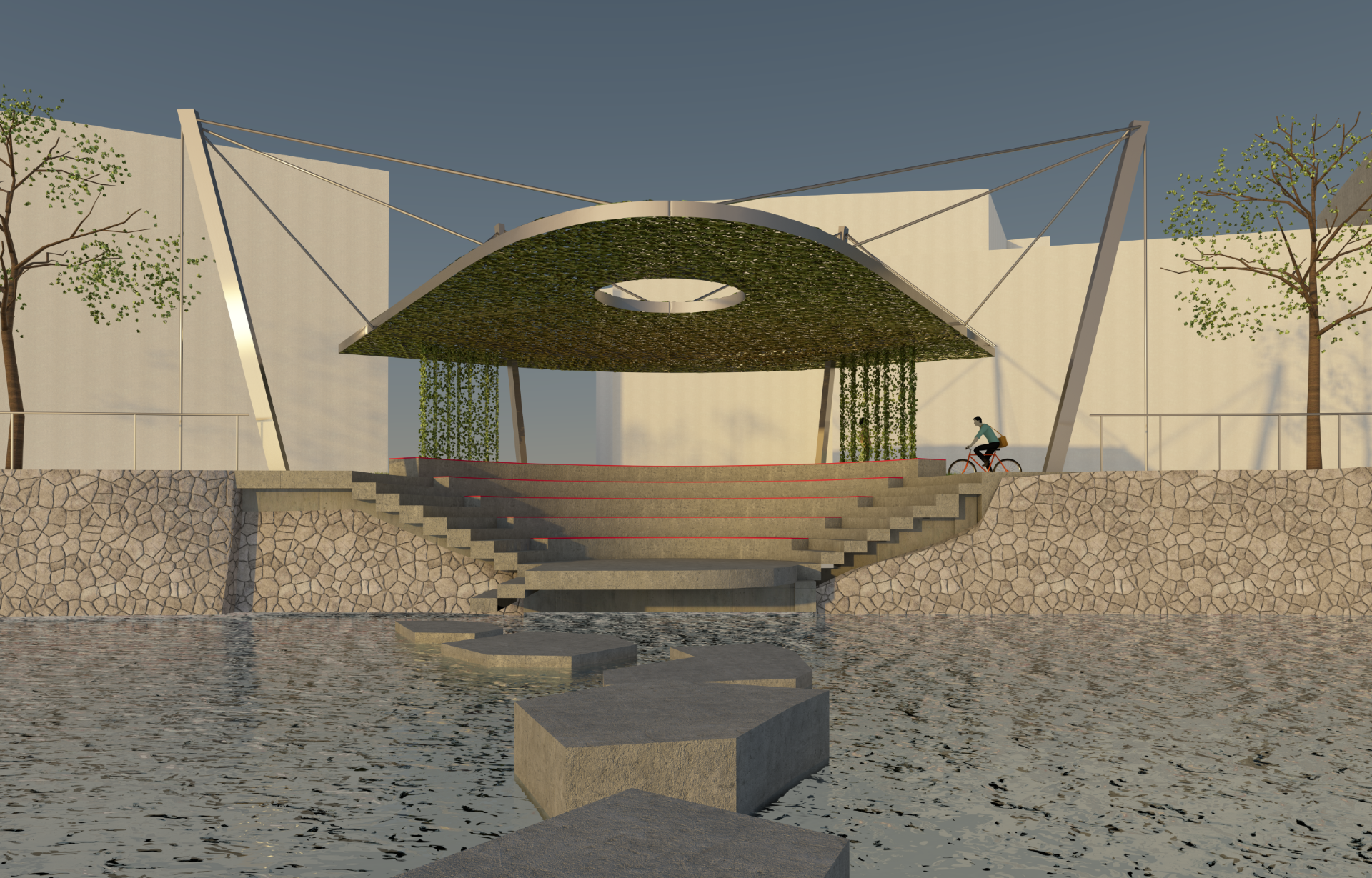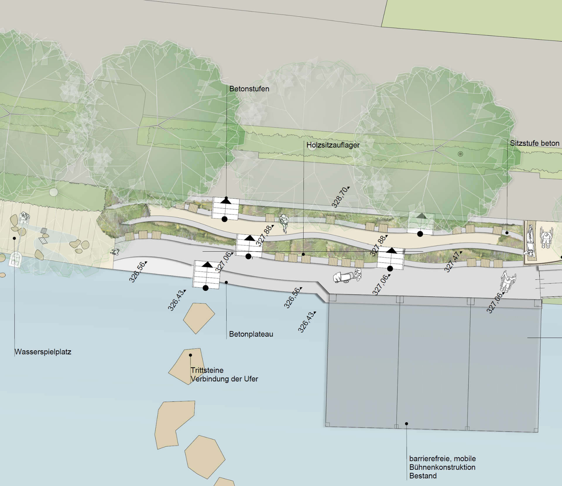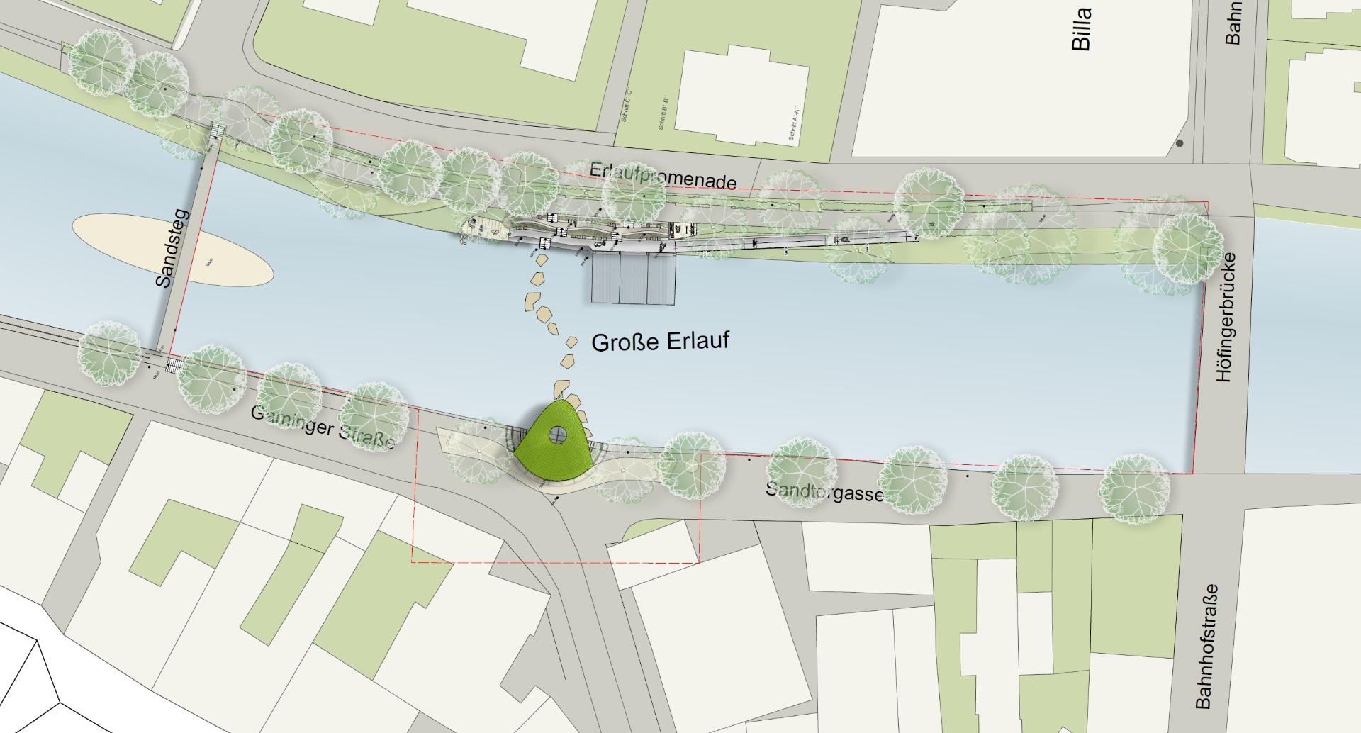 Die Neugestaltung des Erlaufufers in Scheibbs schafft einen vielseitigen, ganzjährig nutzbaren Freiraum, der Erholung, Naturerlebnis, Kultur und städtisches Leben verbindet. Als grüne Verlängerung des Stadtzentrums stärkt der Uferbereich die Aufenthaltsqualität und Identität der Stadt. Ruhige Erholungszonen mit Sitz- und Liegeflächen laden zum Verweilen ein, barrierefreie Wege und Stege erleichtern den Zugang zum Wasser. Naturnahe Bereiche mit heimischen Pflanzen, Wiesen und kleinen Beobachtungsplätzen fördern Biodiversität und das Bewusstsein für die ökologische Bedeutung der Erlauf. Gleichzeitig bieten temporäre Bühnen und die beschattete Mole Raum für kulturelle Veranstaltungen, Feste und soziale Begegnungen. Nachhaltige Materialien, versickerungsfähige Beläge und klimaangepasste Bepflanzung sichern ökologischen Mehrwert und Langlebigkeit. Durch die flexible Nutzung und Einbindung lokaler Akteure entsteht ein identitätsstiftender Freiraum, der Ruhe, Erlebnis und städtische Lebendigkeit harmonisch vereint.