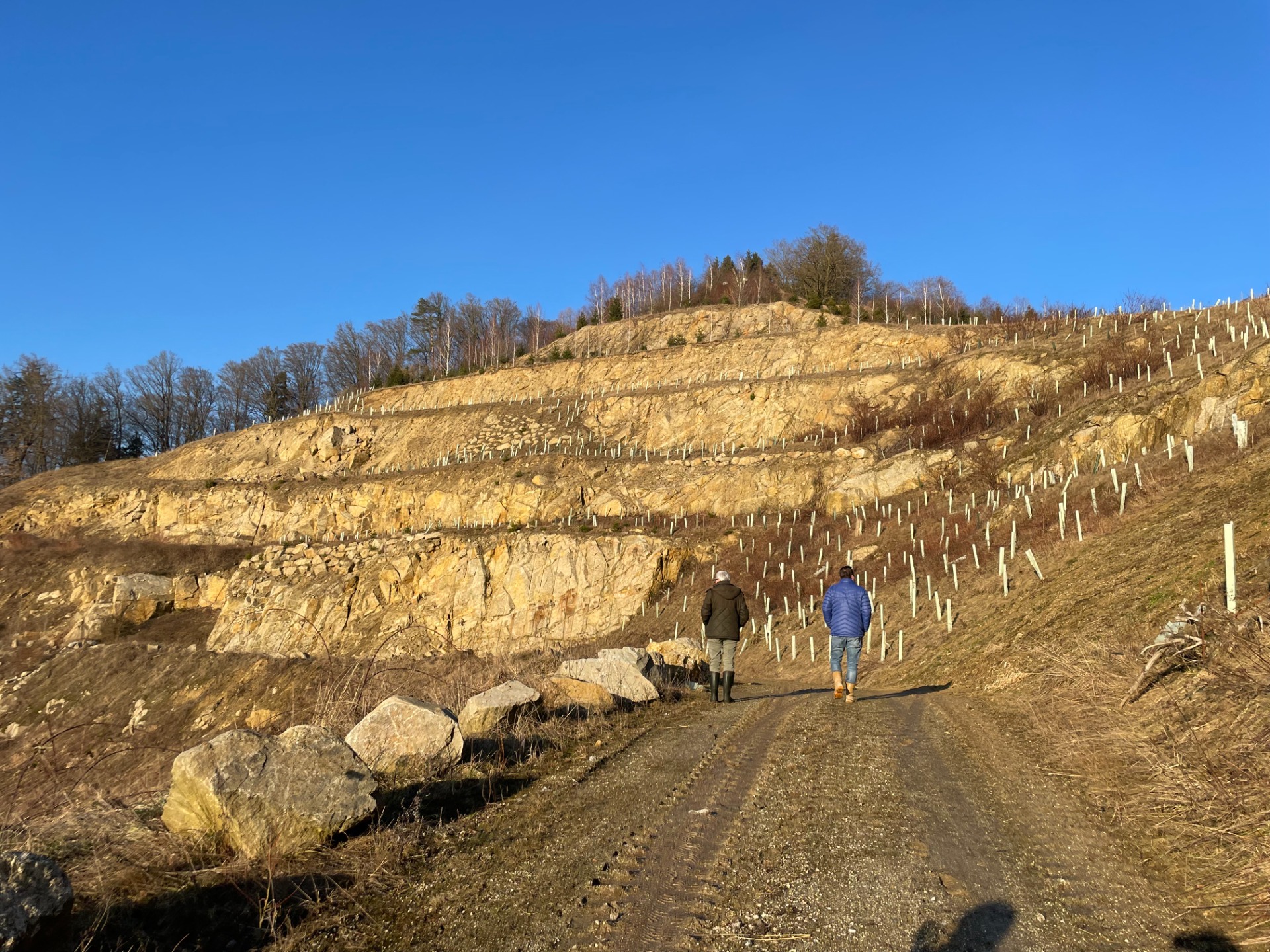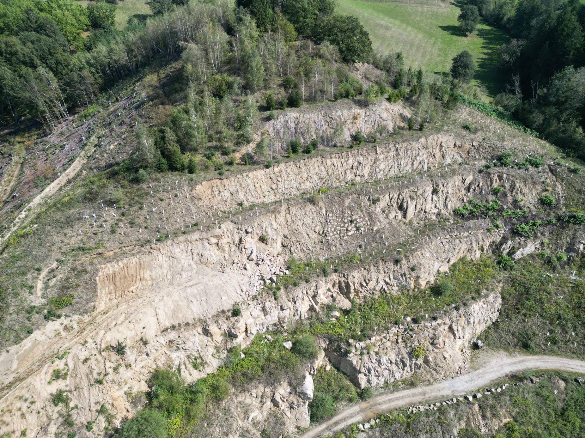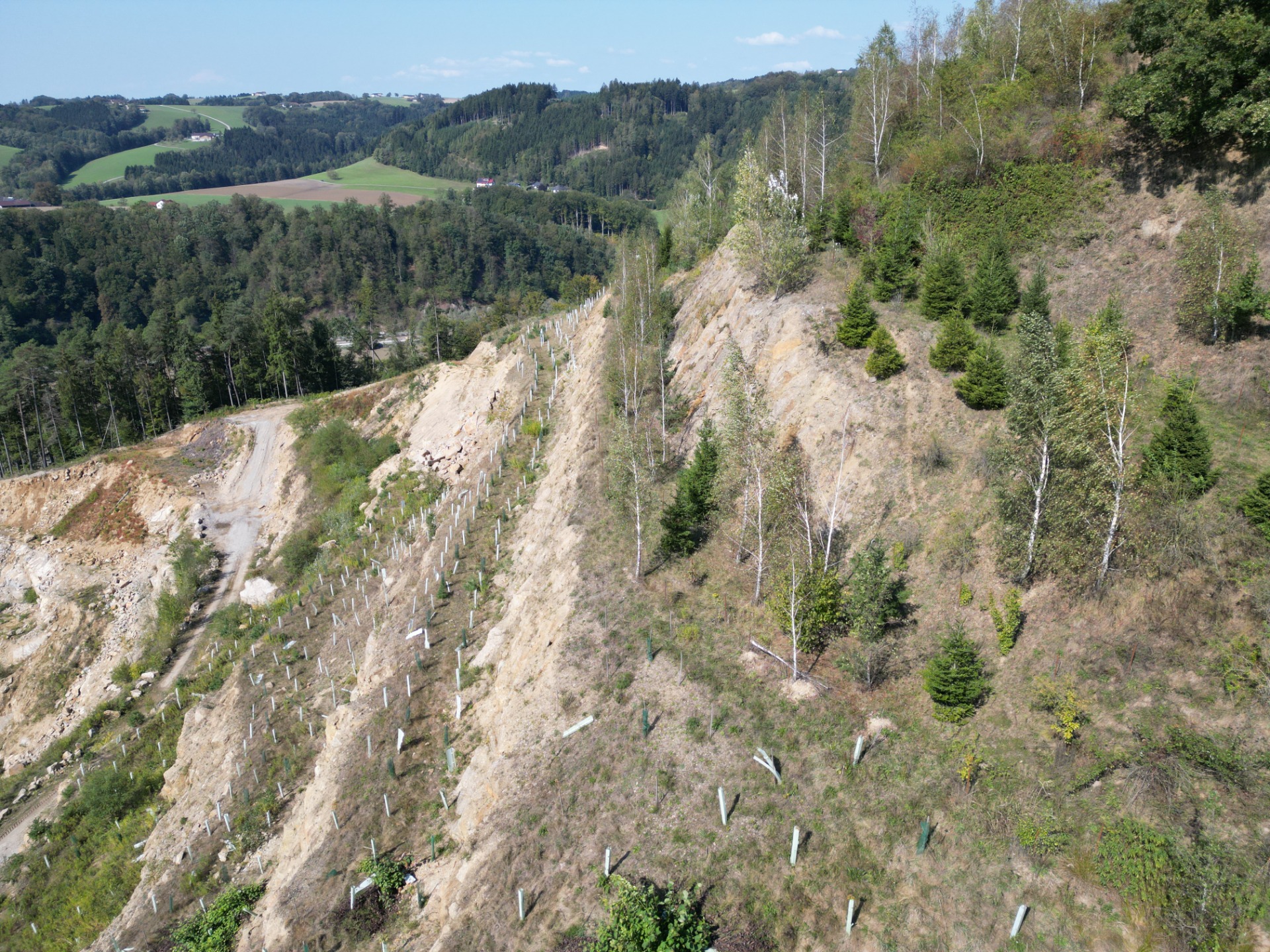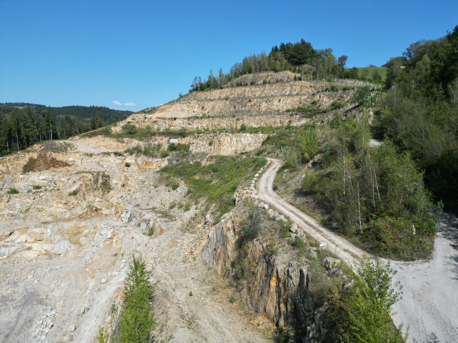 Das Projekt am Granitsteinbruch fokussiert die Transformation eines aktiven Gewinnungsstandortes in ein ökologisch wertvolles Habitat. Im Zentrum der landschaftsarchitektonischen Begleitung steht die sukzessive Rekultivierung der Abbauetagen. Durch gezielte Aufforstungen und die Anpassung der Böschungsgeometrien an die geologisch-geotechnischen Gegebenheiten wird eine harmonische Wiedereingliederung in das Landschaftsbild erreicht.