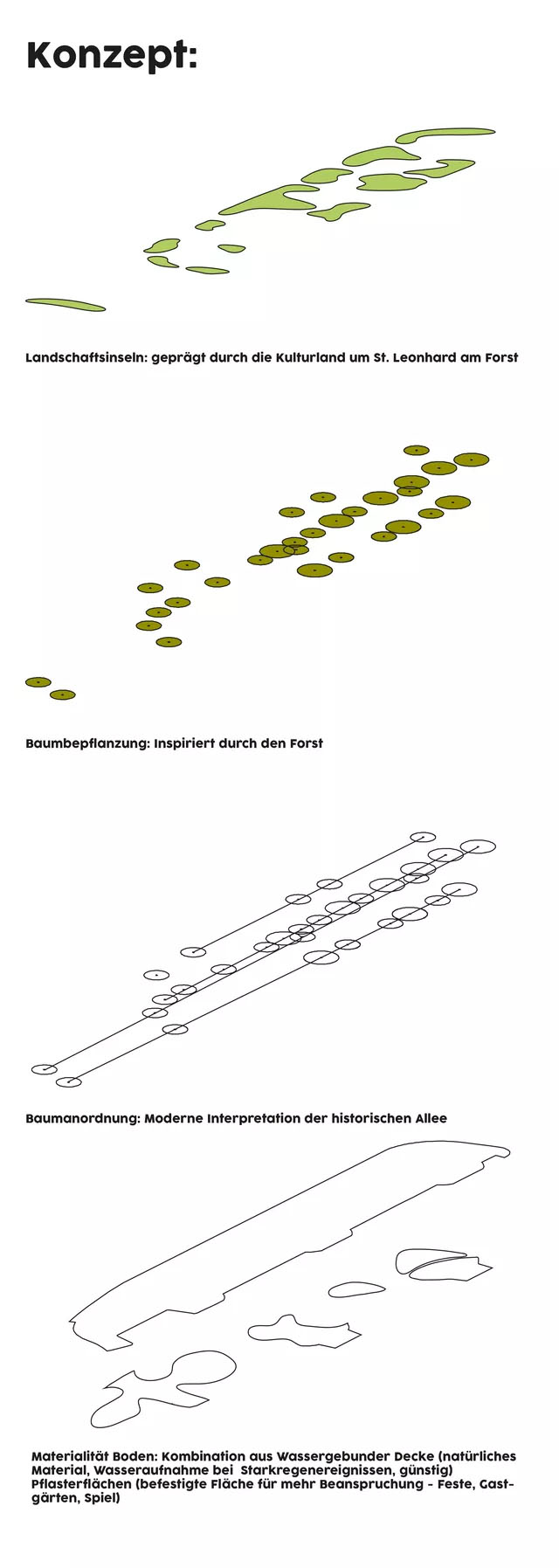 Die amorph angeordneten Gestaltungsinseln v.a. Grün- und Pflasterinseln als kennzeichnende horizontale Strukturen sind das lebendige Milieu des Marktplatzes und ein Zitat der Landschaft um St. Leonhard: sie dienen unter anderem als Bepflanzungsflächen (Stauden, Kräuter, Getreide, Saumvegetation, Gräser, Rasen etc.), Sitzflächen (v.a. Sitzränder mit Auflagen, Sitzbänke), Wasserfläche („Brunnen“), Veranstaltungsräume (Adventmarkt, Wochenmarkt etc.), Schanigärten (in Verbindung mit benachbarter Gastronomie), Unterstand (Wartebereich öffentlicher Verkehr). Die gezielte Anlage der „Landschaftsinseln“ schafft einen positiven Lenkungseffekt für den Besucher, schützt ihn gegenüber den frequentierten Straßen und bietet heimelige Nischen. Die „grünen“ Gestaltungsinseln sind – wie auch die Landschaft um St. Leonhard – leicht wellig modelliert und bilden mit den Aufenthaltsbereichen am Marktplatz funktionelle Einheiten. Sie bereichern, beleben, gliedern, begrünen, beleuchten und sind so vielfach nutzbar. Zusammen mit den Baumreihen bilden die Gestaltungsinseln den roten Faden am Marktplatz und verleihen ihm räumliche Qualitäten wie Wiedererkennbarkeit und Repräsentativität.