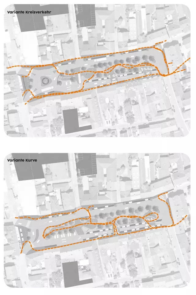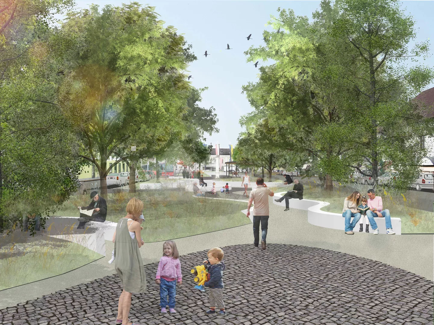 Der Gestaltungsvorentwurf berücksichtigt die angepassten Verkehrsflächen am Platz, die wesentlich zur äußeren Form der „grünen“ Freifläche beitragen. Verkehrstechnische Lösungsvarianten fließen in die 2 Varianten der Vorentwürfe für den Freiraum ein und werden derart ausgearbeitet, dass sie im öffentlichen Entscheidungsprozess dienlich sind. Visualisierungen der Platzgestaltung neu stellen wichtige Grundlagen bei den bevorstehenden Bürgerversammlungen dar und sollen das Gestaltungskonzept einem breiten Publikum vermitteln helfen. Der Vorentwurf bietet Raum für den öffentlichen Verkehr in Form einer Haltestelle und Wartebereiches am Platz.