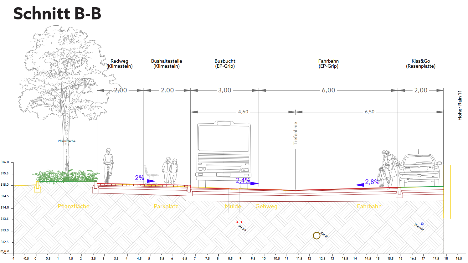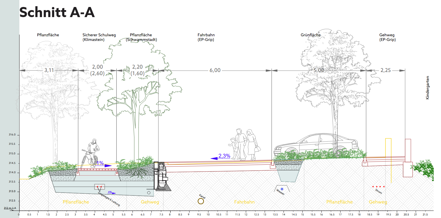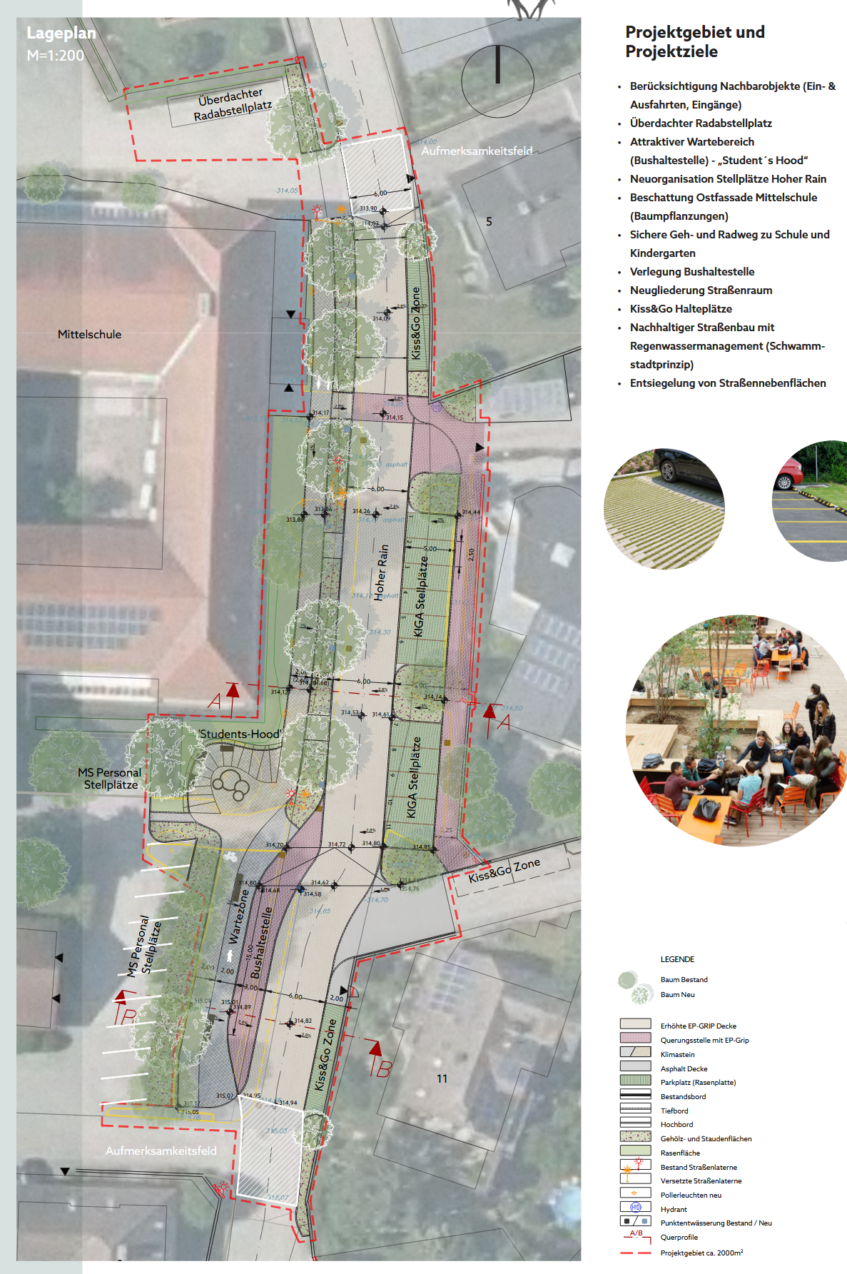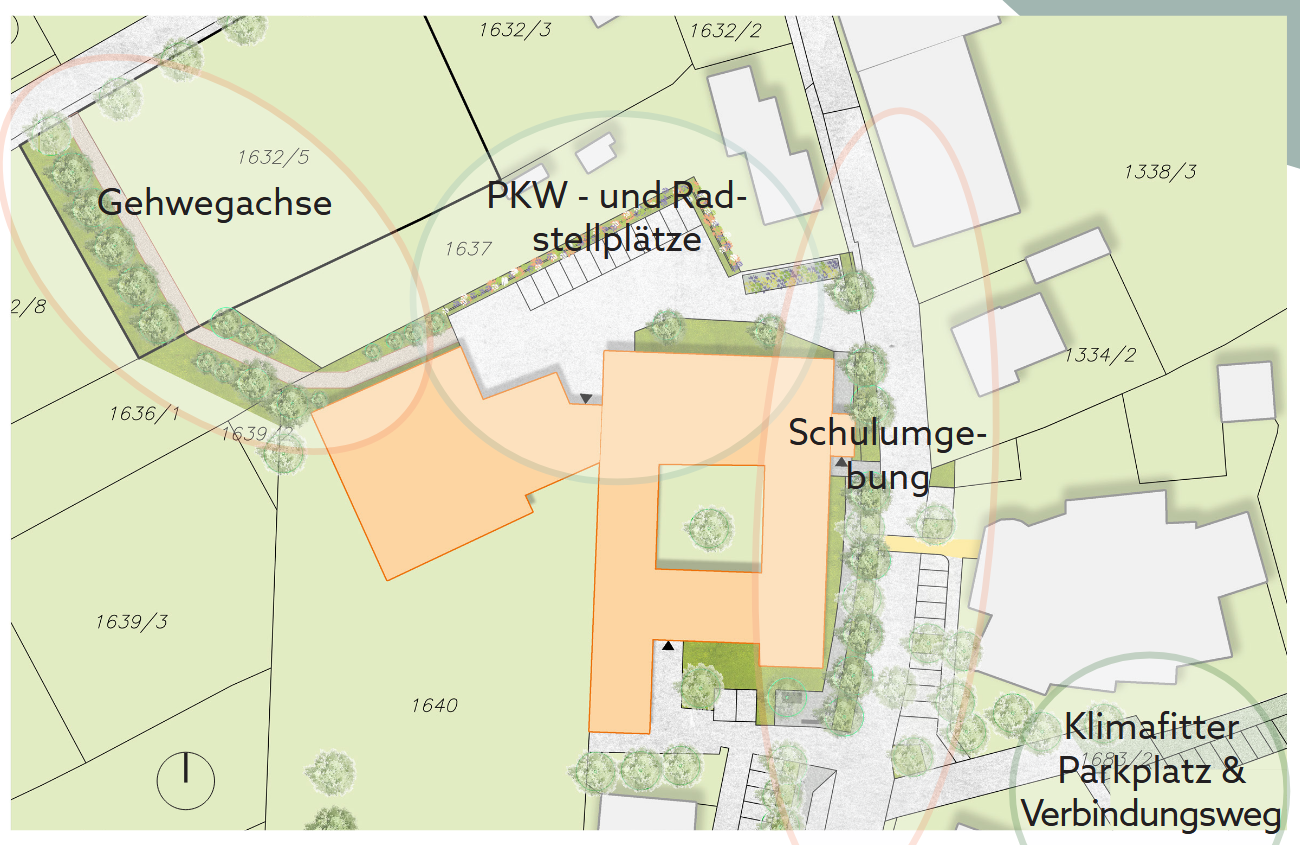 Das gestalterische Konzept setzt auf eine nachhaltige Neuordnung: Weitläufige Asphaltflächen weichen einer klimaresilienten Schwammstadt-Struktur. Durch gezielte Entsiegelung, ein integriertes Regenwassermanagement und schattenspendende Baumstrukturen wird das Mikroklima spürbar verbessert.