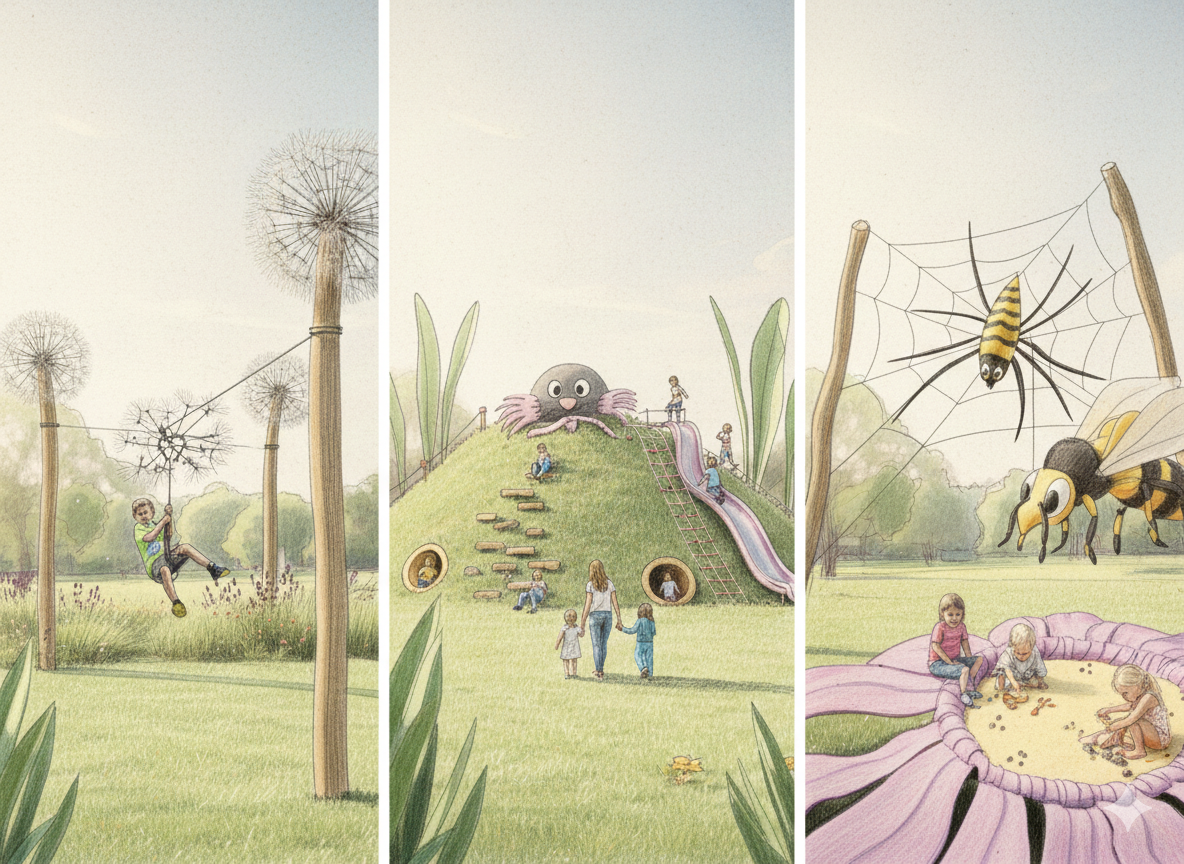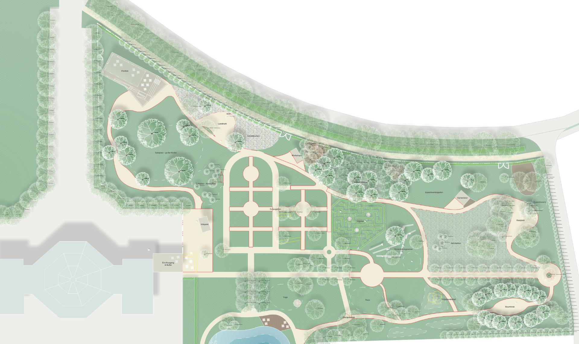 In enger Abstimmung mit ausgewählten Projektpartnern entstanden atmosphärische Schauflächen, die gemeinsam mit dem Café- und Bistrobereich eine idyllische Einheit bilden. Ein besonderes Highlight ist das Spielareal, das Themen wie das Erdreich, Insekten und fliegende Pusteblumen gestalterisch aufgreift. So verbinden wir fundierte Landschaftsplanung mit einer narrativen Erlebniswelt, die als Inspirationsquelle und Besuchermagnet fungiert.