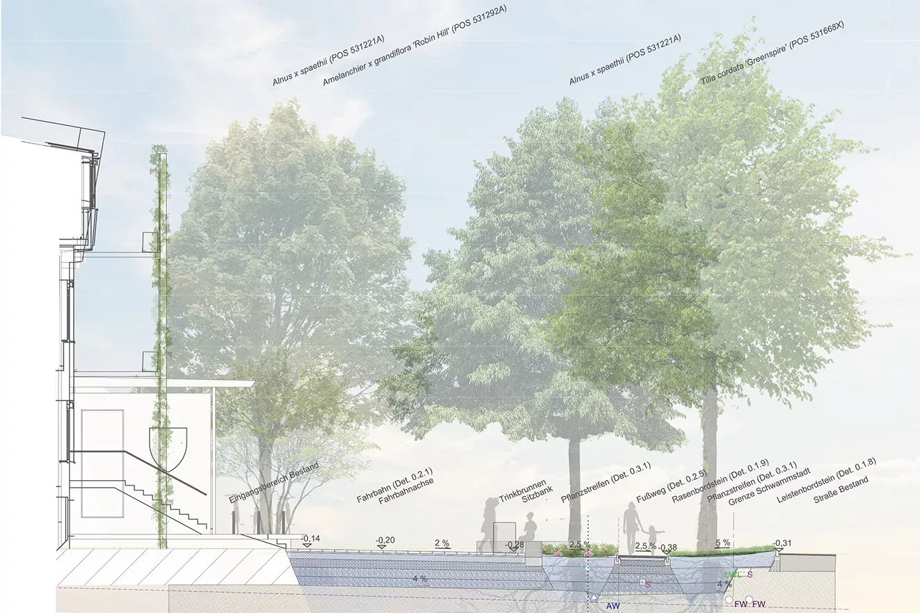 Die Idee der maximalen Begrünung wurden durch das Pflanzen zahlreicher Gehölze, einer freistehenden üppigen Fassadenbegrünung und der Erweiterung der Stauden- und Grünflächen umgesetzt. Um ein möglichst angenehmes Kleinklima zu fördern, wurden sickerfähige Oberflächenmaterialien gewählt, den Pflanzen größtmöglicher Wurzelraum nutzbar gemacht und der Unterbau nach Schwammstadtprinzip ausgeführt.