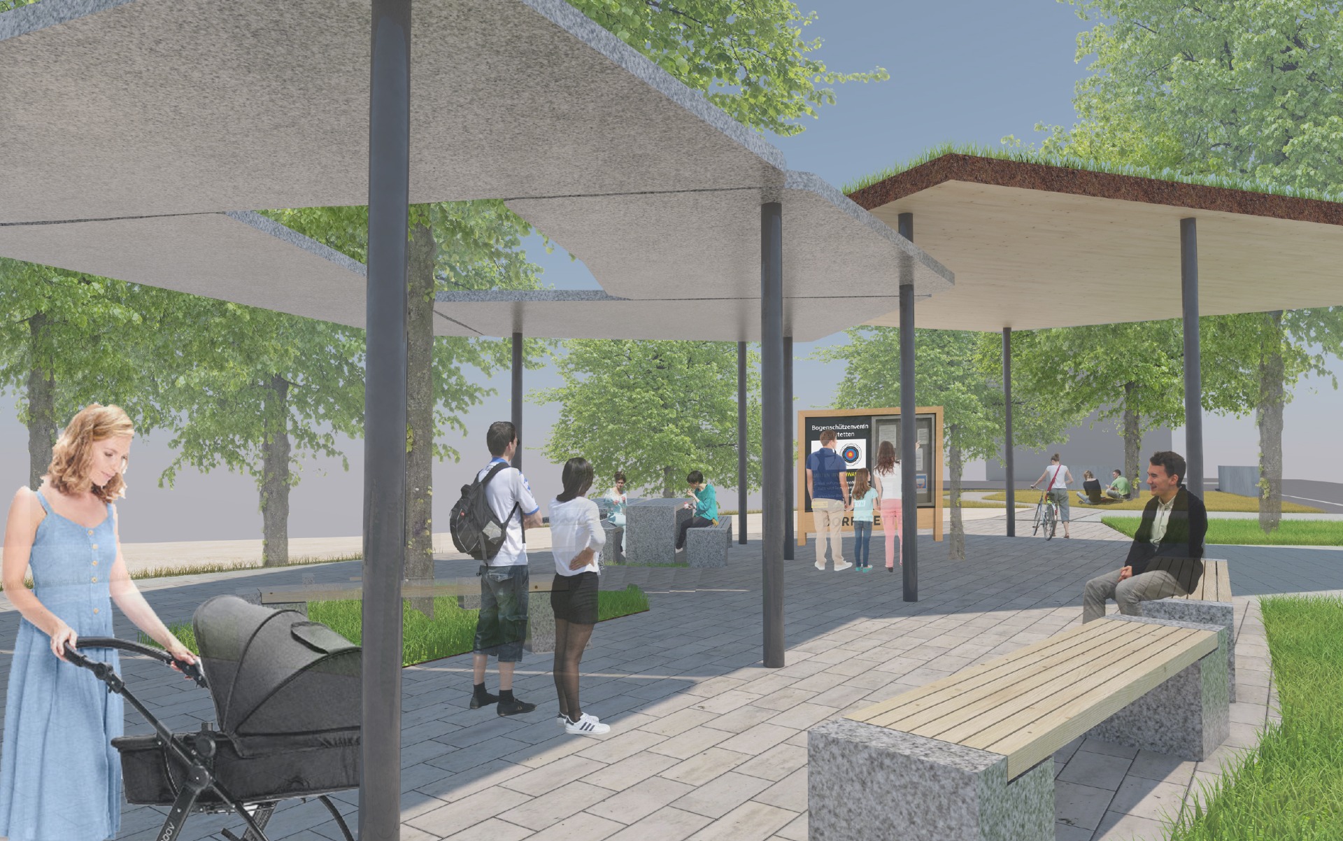Die Neugestaltung des Dorfplatzes in Dorfstetten schafft im Ortszentrum einen offenen, lebendigen Freiraum, der Aufenthaltsqualität und Verkehrssicherheit vereint. Zwischen Kindergarten, Schule, Kirche und Gemeindeamt entsteht eine vielseitig nutzbare Begegnungszone für Alltag, Feste und kulturelle Veranstaltungen. Zwei Pavillons aus Holz und Granit bilden symbolische Zentren und verweisen auf die regionale Identität. Entsiegelte, versickerungsfähige Flächen verbessern das Regenwassermanagement und fördern ökologisches Bauen. Begrünte Bereiche mit klimaresilienten Pflanzen steigern Biodiversität und Mikroklima. Verkehrsberuhigende Maßnahmen erhöhen die Sicherheit, besonders für Kinder. Insgesamt entsteht ein grüner, klimafreundlicher, weitgehend barrierefreier Ortskern, der Gemeinschaft stärkt, Lebensqualität erhöht und Dorfstetten ein identitätsstiftendes Zentrum verleiht.