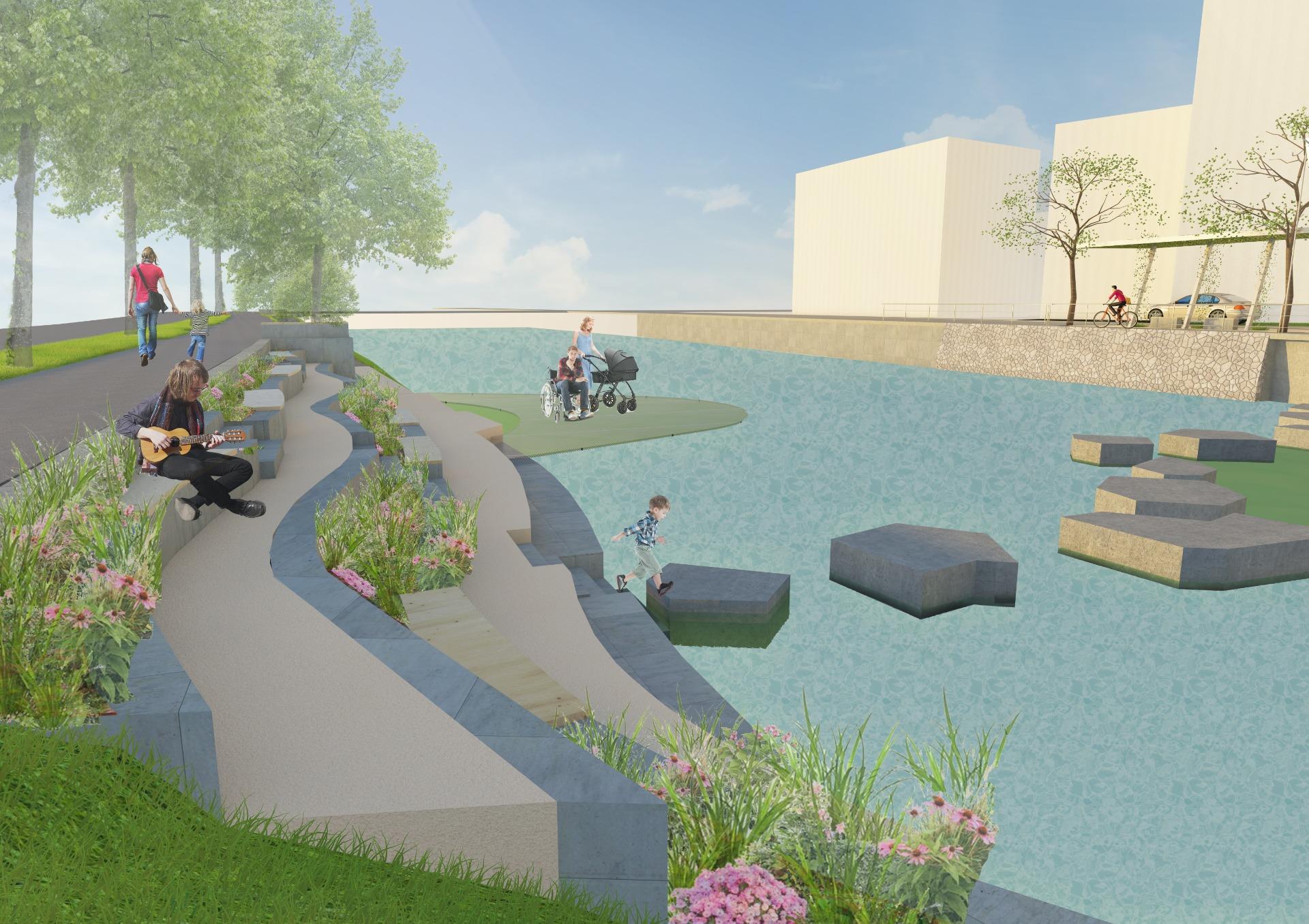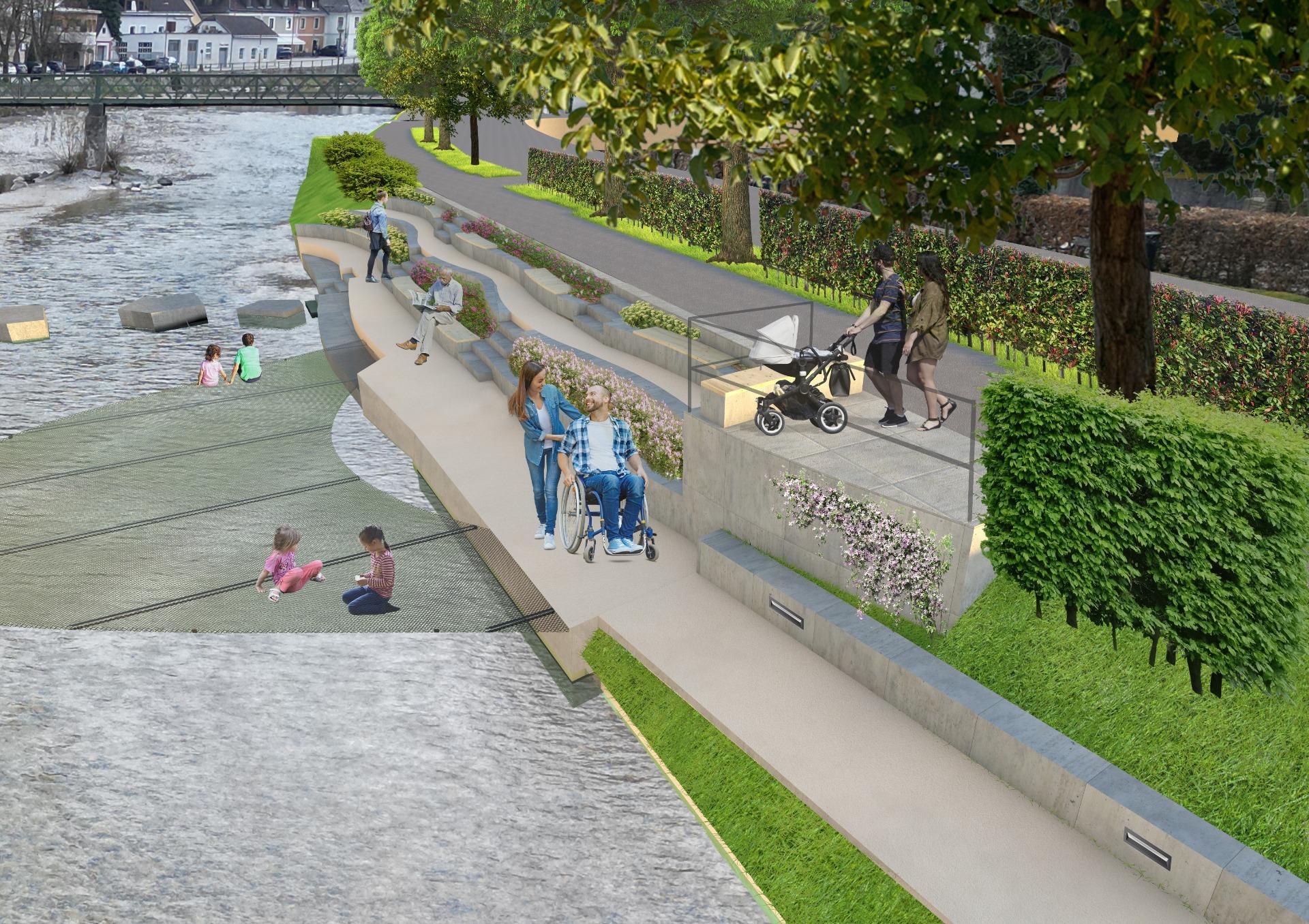 Die Neugestaltung des Erlaufufers in Scheibbs schafft einen vielseitigen, ganzjährig nutzbaren Freiraum, der Erholung, Naturerlebnis, Kultur und städtisches Leben verbindet. Als grüne Verlängerung des Stadtzentrums stärkt der Uferbereich die Aufenthaltsqualität und Identität der Stadt. Ruhige Erholungszonen mit Sitz- und Liegeflächen laden zum Verweilen ein, barrierefreie Wege und Stege erleichtern den Zugang zum Wasser. Naturnahe Bereiche mit heimischen Pflanzen, Wiesen und kleinen Beobachtungsplätzen fördern Biodiversität und das Bewusstsein für die ökologische Bedeutung der Erlauf. Gleichzeitig bieten temporäre Bühnen und die beschattete Mole Raum für kulturelle Veranstaltungen, Feste und soziale Begegnungen. Nachhaltige Materialien, versickerungsfähige Beläge und klimaangepasste Bepflanzung sichern ökologischen Mehrwert und Langlebigkeit. Durch die flexible Nutzung und Einbindung lokaler Akteure entsteht ein identitätsstiftender Freiraum, der Ruhe, Erlebnis und städtische Lebendigkeit harmonisch vereint.