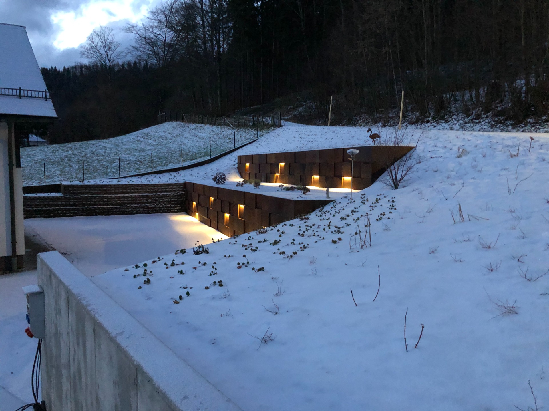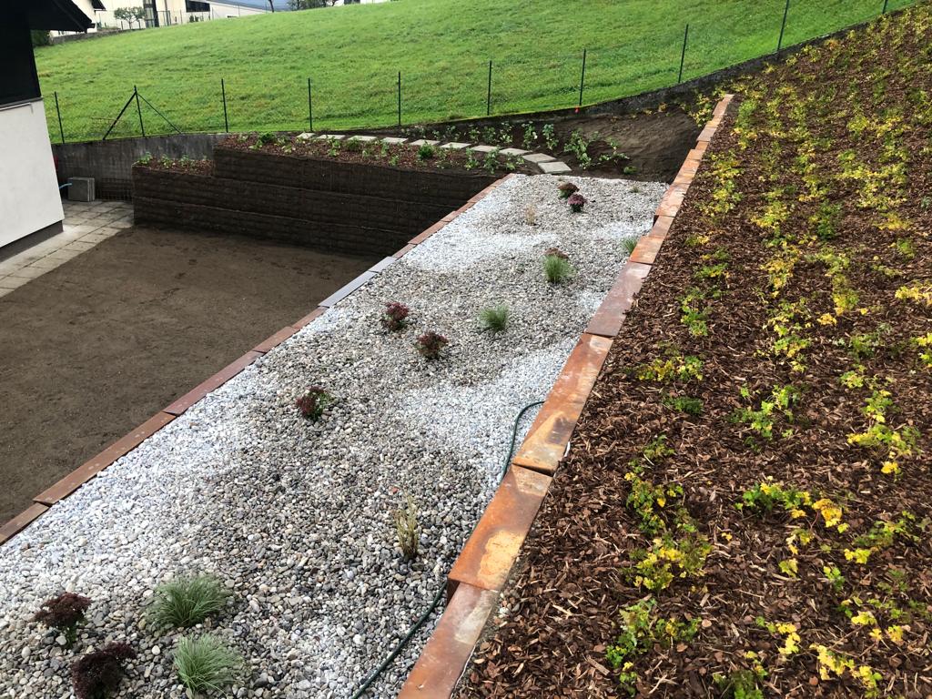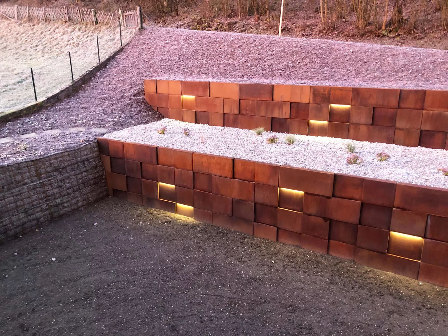 Zentrales Anliegen der Gartenplanung war die Schaffung einer ebenen Nutzfläche durch die Errichtung einer beleuchteten Stützmauer mit Cortenstahlverblendung und die anschließende Gestaltung einer bepflanzten Böschung. Die Terrassierung strukturiert das Gelände, schafft Sichtbezüge und bietet ökologische Aufwertung durch standortgerechte Bepflanzung. Ein pflegeleichter Wartungs- und Zugangsweg ermöglicht einfache Instandhaltung, während ein angrenzender Sitzplatz in angenehmer Atmosphäre zum Verweilen einlädt. Das Konzept verbindet Funktionalität, Ästhetik und Aufenthaltsqualität zu einem harmonischen Gartenerlebnis.