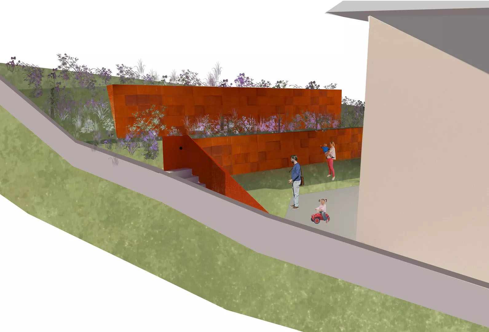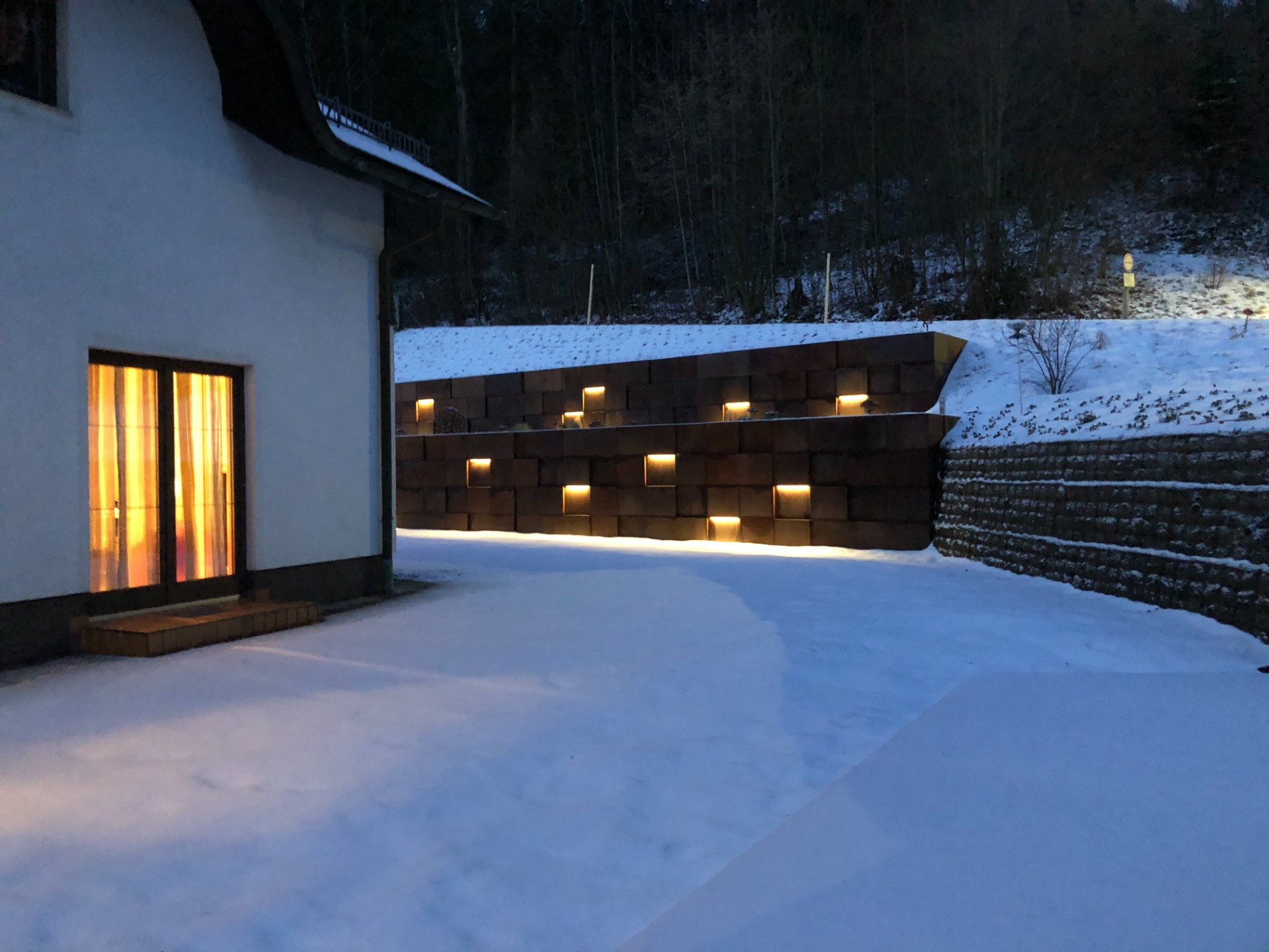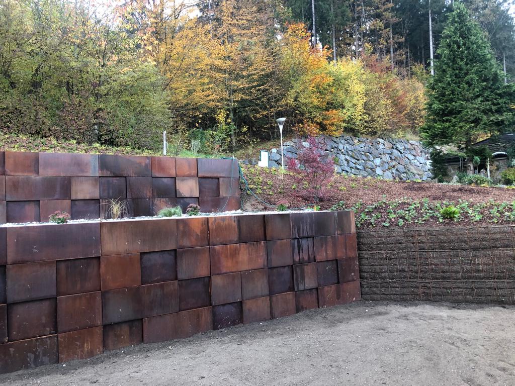 Zentrales Anliegen der Gartenplanung war die Schaffung einer ebenen Nutzfläche durch die Errichtung einer beleuchteten Stützmauer mit Cortenstahlverblendung und die anschließende Gestaltung einer bepflanzten Böschung. Die Terrassierung strukturiert das Gelände, schafft Sichtbezüge und bietet ökologische Aufwertung durch standortgerechte Bepflanzung. Ein pflegeleichter Wartungs- und Zugangsweg ermöglicht einfache Instandhaltung, während ein angrenzender Sitzplatz in angenehmer Atmosphäre zum Verweilen einlädt. Das Konzept verbindet Funktionalität, Ästhetik und Aufenthaltsqualität zu einem harmonischen Gartenerlebnis.