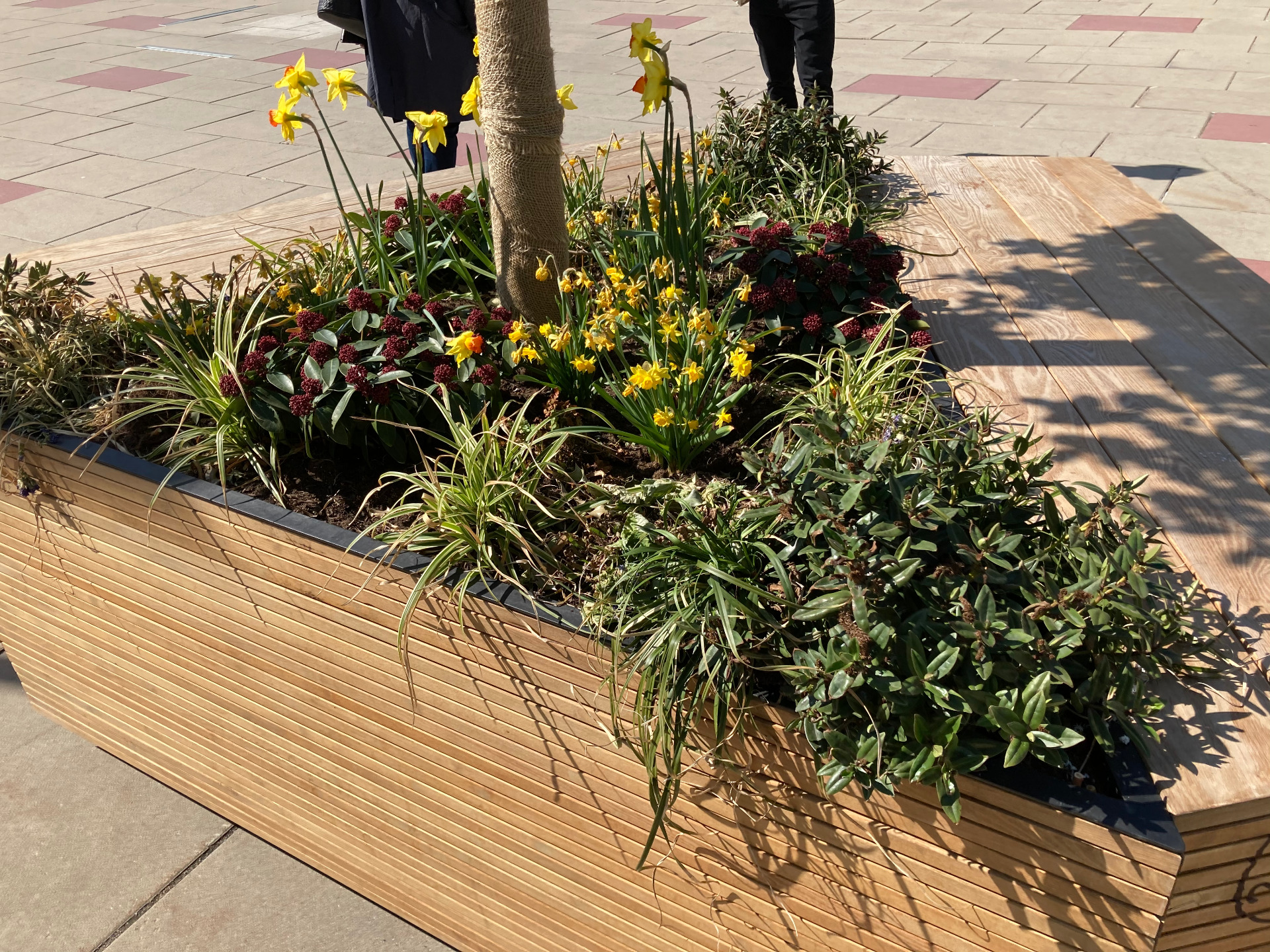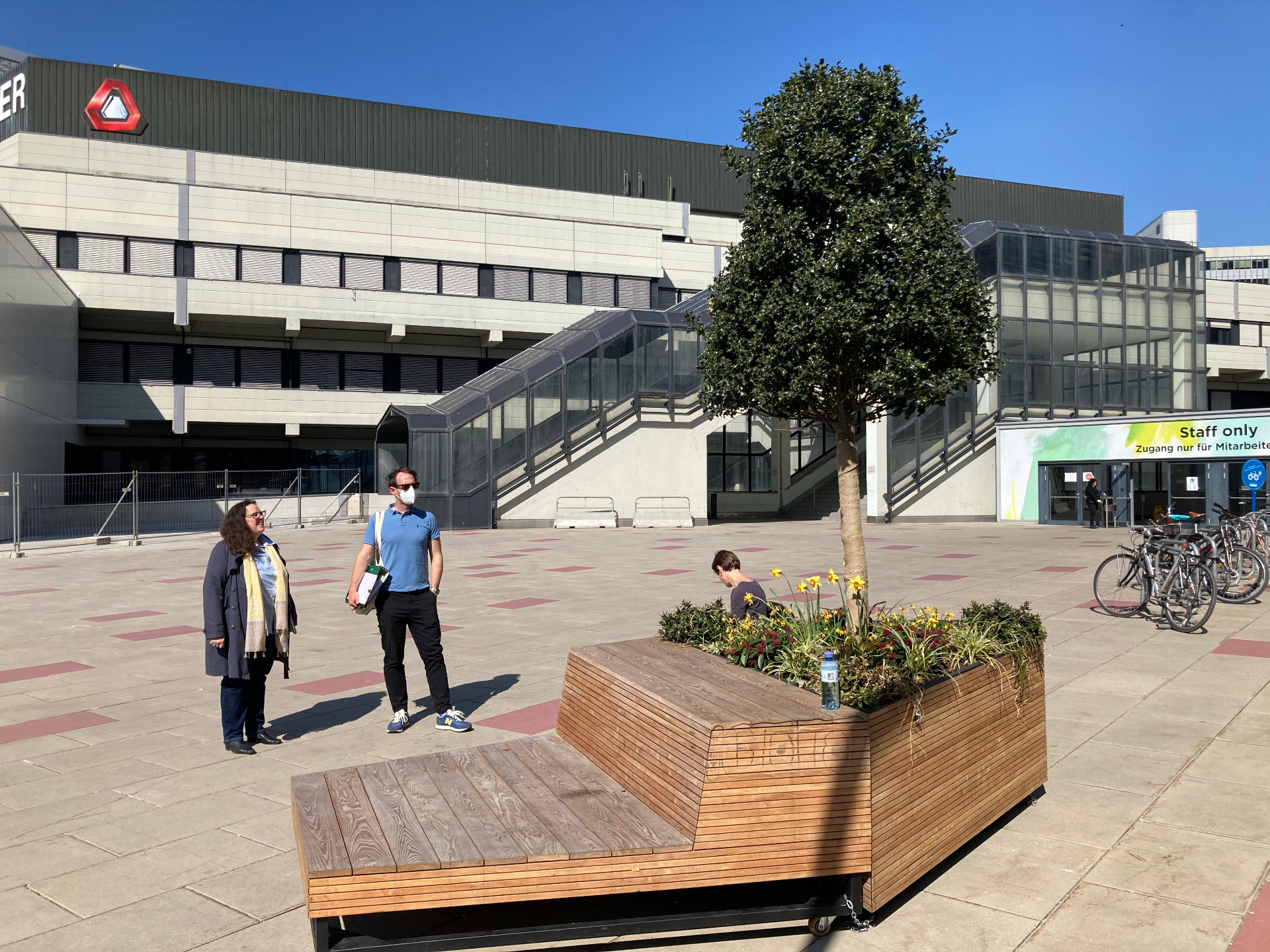 Das hybride Sitzmobiliar bietet ein breites Spektrum an ergonomischen Qualitäten: Von klassischen Sitzbereichen mit Rückenlehne bis hin zu großzügigen Liegeflächen schaffen die Elemente Orte der Entschleunigung – „Möbel zum Zeitnehmen“. Diese gestalterischen Interventionen fungieren als mikroklimatische Ankerpunkte, die durch gezielte Bepflanzungsstrukturen die Aufenthaltsqualität im urbanen Steinfeld nachhaltig steigern. Die multifunktionale Architektur der Module fördert sowohl den informellen Austausch als auch den Rückzug im hochfrequentierten, internationalen Umfeld.